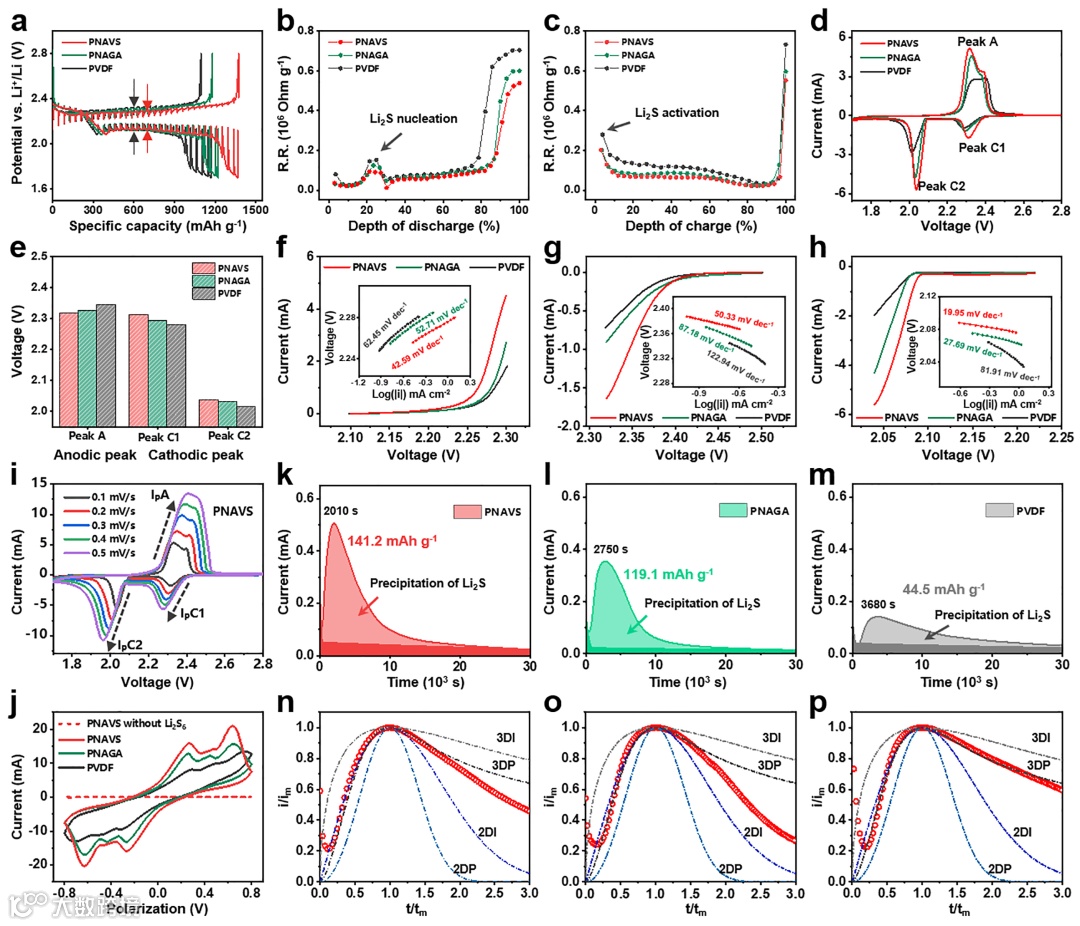 恒电流间歇滴定技术 (GITT)证实PNAVS电极具有更小的极化和电阻,表明了PNAVS粘结剂能使Li-S电池具有低能垒以实现更快更均匀的 Li2S 成核效果、更高的 Li+扩散速率和更快的氧化还原动力学。CV和Tafel曲线显示PNAVS粘结剂具有最高的还原电位和最低的氧化电位,证明其双向快速的反应活性和优异的电催化性能。Randles-Sevick方程计算结果表明PNAVS电极具有最高的锂离子扩散系数,说明官能团与Li+均匀的相互作用以及粘结剂对LiPSs的高吸附性能缩短了离子的传输路径。