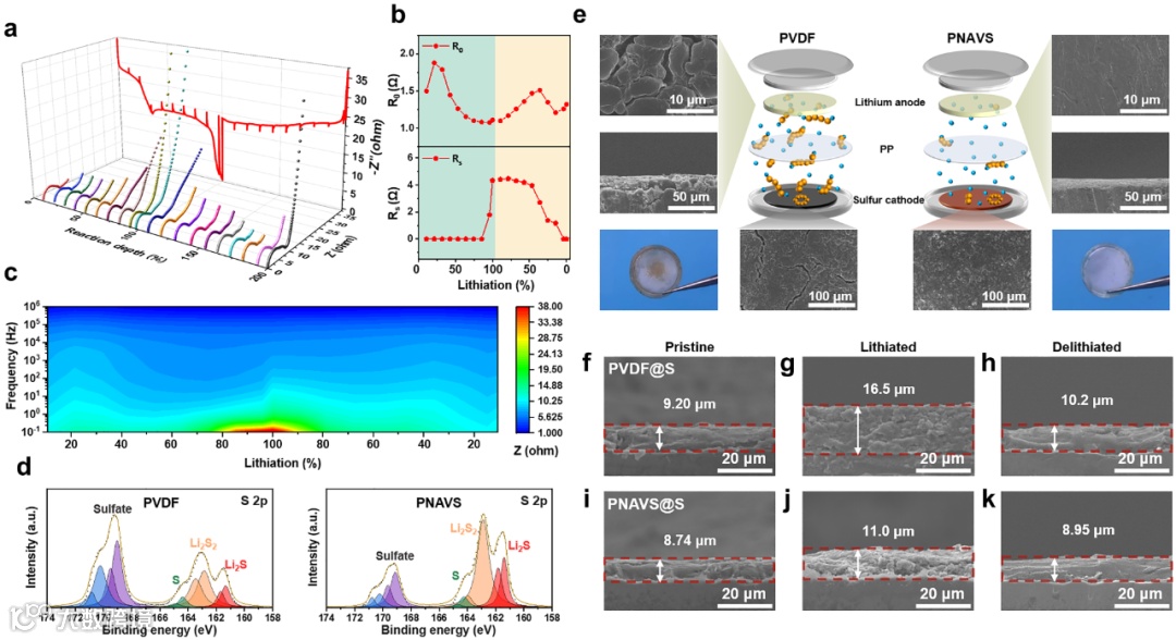 作者进一步利用原位EIS测试研究电极/电解液界面处的电子/离子转移过程。结果显示PNAVS粘结剂在加速氧化还原动力学方面具有良好的协同效应,有助于更均匀的Li2S沉积,在长期循环过程中表现出可逆性和有效电荷/质量传输的可持续性。Bode图进一步证实了具有PNAVS的Li-S电池中的氧化还原反应是可逆且稳定的。放电后的XPS证明了PNAVS的快速LiPSs氧化还原动力学,S8在放电过程中得到了更有效的利用。此外,通过对比使用不同粘结剂的电极的SEM 图像和照片发现:使用PNAVS粘结剂的电池循环后锂金属电极在循环后仍能保持光滑;由于PNAVS对LiPSs的优异吸附,使用PNAVS的电池循环后隔膜几乎没有颜色变化;正极的表面形貌进一步验证了PNAVS粘结剂由于良好的机械性能和高粘合性,即使在长时间循环后也能保持电极的完整性,并且在嵌锂后显示出较小的厚度变化(~25.8%),并在充电后可逆。上述结果均证明所设计的PNAVS粘结剂在高能量密度的锂硫电池中具有优异的实际应用价值。