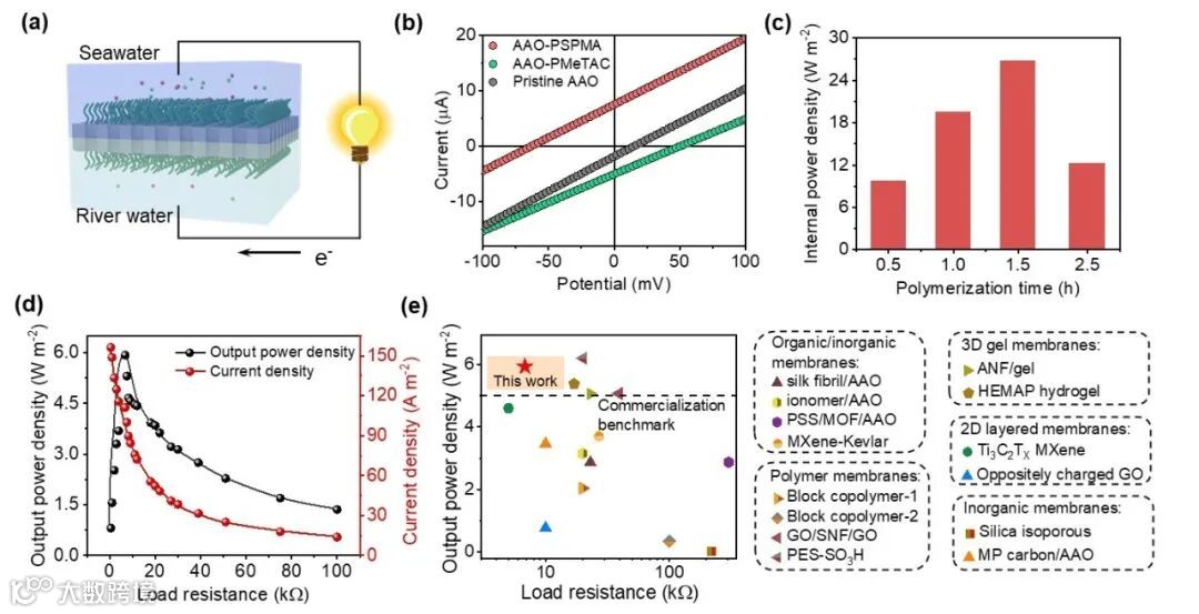 图4 聚合物刷基离子选择性膜的盐浓差性能