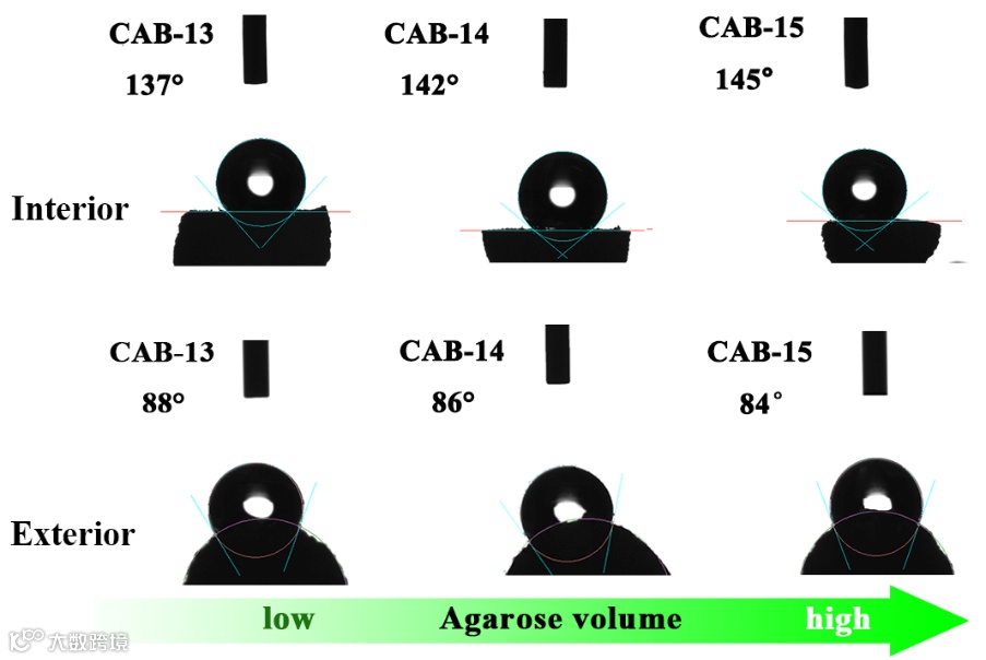 近日,针对气凝胶与富水材料结合在实际应用中的障碍,内蒙古科技大学赛华征副教授课题组,借助仿生学的理念,采用了二次凝胶化的手段构筑“仿石榴结构”的气凝胶微球(CABs)(图1)。具体来说是将疏水性的SiO2气凝胶粉体分散于聚乙烯醇溶液中以后和琼脂糖热溶液混合,再将该混合浆料滴入硅油中,在界面张力的作用下该浆料成球,伴随着琼脂糖的冷却凝胶化使得球形固化,其本质上是一种分散有大量疏水SiO2气凝胶的聚乙烯醇-琼脂糖复合凝胶微球。此时,SiO2气凝胶的孔洞内依然是空气,聚乙烯醇和琼脂糖分子链段相互交联形成水凝胶层(图1c)。将其烘干以后获得一种“仿石榴结构”的复合气凝胶微球,其疏水性的SiO2气凝胶微粒相当于石榴籽,由聚乙烯醇和琼脂糖复合而成的亲水性高分子膜构成石榴外皮(图2c-d)和内部分割石榴籽的内皮(图2f中蓝色圈里)。为了进一步优化CABs的性能,作者探究了聚乙烯醇及琼脂糖溶液浓度对气凝胶微观结构的影响。基于对SEM、BET、TGA等表征分析,选定合理高分子溶液浓度,使微球保留气凝胶高比表面积、低热导率等优异性能。