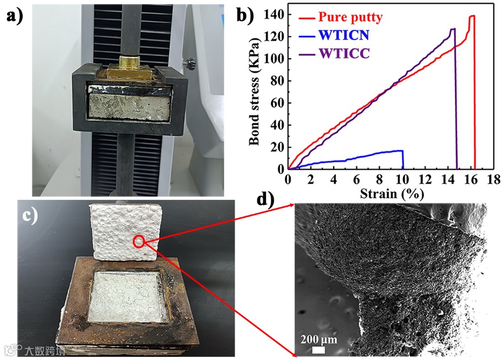 接触角表征分析表明,CABs具有独特的浸润性,呈现出外部亲水而内部疏水的特性(图3),从而使其在与水性材料复合使用时不仅能够呈现良好的兼容性,而且依然能够有效抵御水汽对凝胶骨架的破坏。通过拉拔强度测试,CABs与水性材料复合所得到的复合涂层(WTICC)相较于普通气凝胶粉末与水性材料复合所得到的复合涂层(WTICN)粘结强度提高了近八倍(图4),从根本上解决了疏水性气凝胶材料与水性基体相容性差的问题。