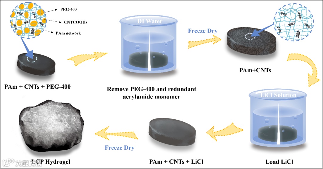 在全球缺水的情况下,简单、低成本和高性能的大气集水(AWH)仍然是一个挑战。基于水凝胶聚合物的大气集水拥有低成本,易控制,易大批量制造的优势。但是传统的基于水凝胶的AWH策略一般都有吸水缓慢的问题。这是因为水凝胶对水的吸收是从块状水凝胶的表面到核心逐渐发生的。表面上的盐颗粒聚集并形成钝化层,水蒸气渗透性大大降低,导致吸附时间延长。因此,迫切需要开发一种简单而经济的AWH技术,用于大规模和高性能的大气水收集。