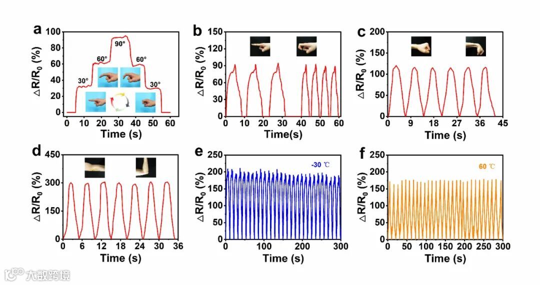 图 7. a) PVI-ChCl-Gly在不同弯曲角度(0°、30°、60°、90°)下的相对电阻变化。b) 不同频率下手指运动的相对电阻变化。手腕(c)和肘部(d)的相对电阻变化。(e-f) -30 ℃和60 ℃的相对电阻变化。