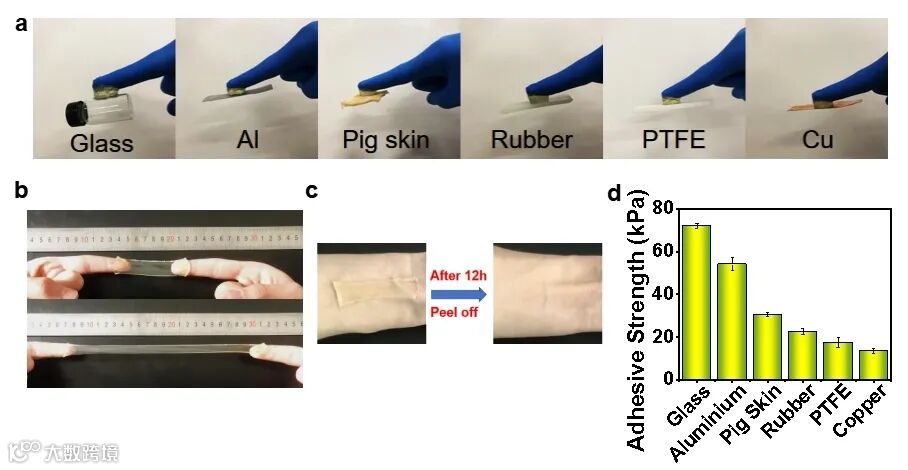 图 5. a) PVI-ChCl-Gly粘附在不同基材上的照片。b) 随皮肤的变形图。c) 凝胶附着在皮肤上12小时和去除凝胶后皮肤的照片。d) PVI-ChCl-Gly在各种基材上的粘附强度。