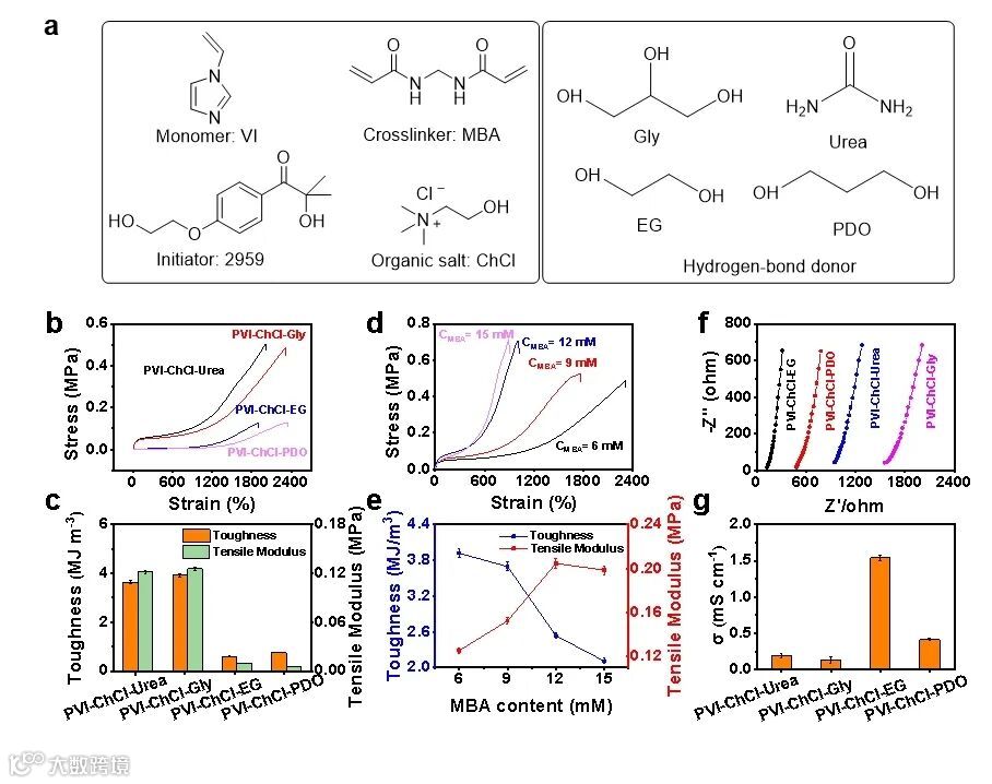 图 1. a) 单体、交联剂、引发剂、DESs的化学结构式。b)四种共晶凝胶的拉伸应力-应变曲线。c) 四种共晶凝胶的拉伸模量和韧性值。d)不同MBA含量的共晶凝胶的拉伸应力-应变曲线。e) 不同 MBA 含量的共晶凝胶的拉伸模量和韧性。f)四种共晶凝胶在室温下的 EIS谱。g) 四种共晶凝胶的电导率。