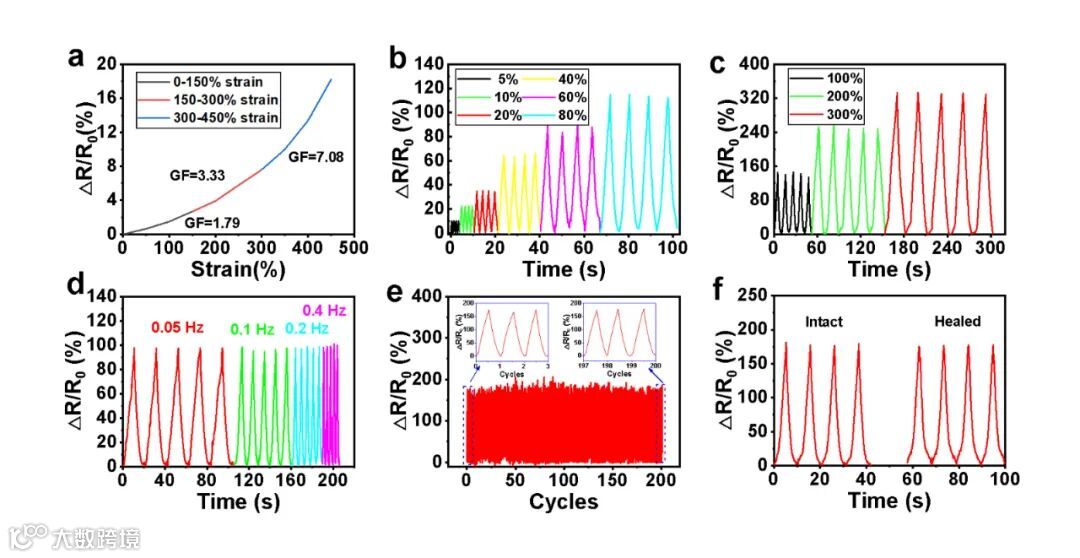 图 6. a) PVI-ChCl-Gly相对电阻率随应变的变化规律。 b-c) PVI-ChCl-Gly在各种应变下循环拉伸的相对电阻变化。d) PVI-ChCl-Gly在不同周期下的相对电阻变化。e) 100%应变反复卸载下的相对电阻变化。f) 自愈过程对相对电阻变化的影响。