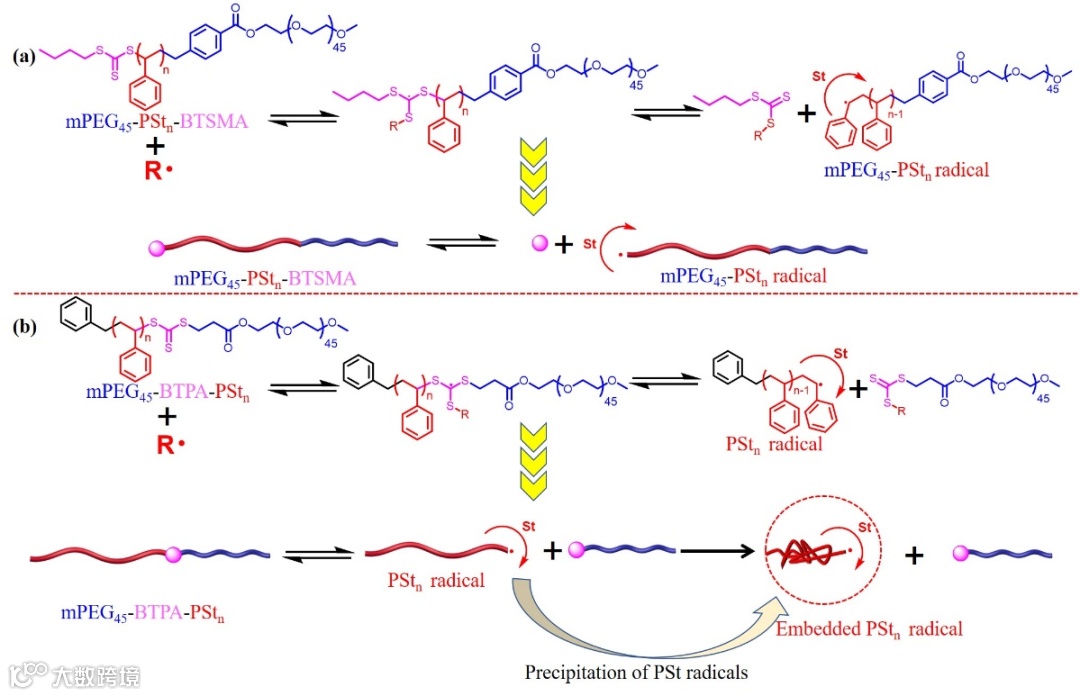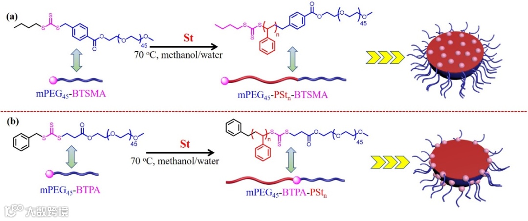 非均相可逆加成-断裂链转移(RAFT)自由基聚合是制备具有结构明确及形貌可控的聚合物粒子的一种重要方法。在非均相RAFT聚合中,主要使用亲溶剂的大分子RAFT(Macro-RAFT)试剂进行调控。目前应用于非均相RAFT聚合的Macro-RAFT通常是R型的(亲溶剂链段与RAFT基团的离去(R)基团连接),RAFT基团始终位于嵌段共聚物的链末端,因此RAFT基团最终会包埋在聚合物颗粒的内部。与之相对, Z型Macro-RAFT(亲溶剂链段与RAFT基团的固定(Z)基团连接)调控的非均相RAFT聚合报道还较少,主要原因是使用Z型Macro-RAFT很难得到结构明确和形貌可控的聚合物粒子。使用Z型Macro-RAFT时,RAFT基团始终位于亲溶剂嵌段和疏溶剂嵌段之间,最终RAFT基团会位于聚合物颗粒的表面。虽然目前的研究表明RAFT基团的空间位置对非均相RAFT聚合有着重要的影响,但是对于其机理研究及调控策略的报道还比较缺乏。
