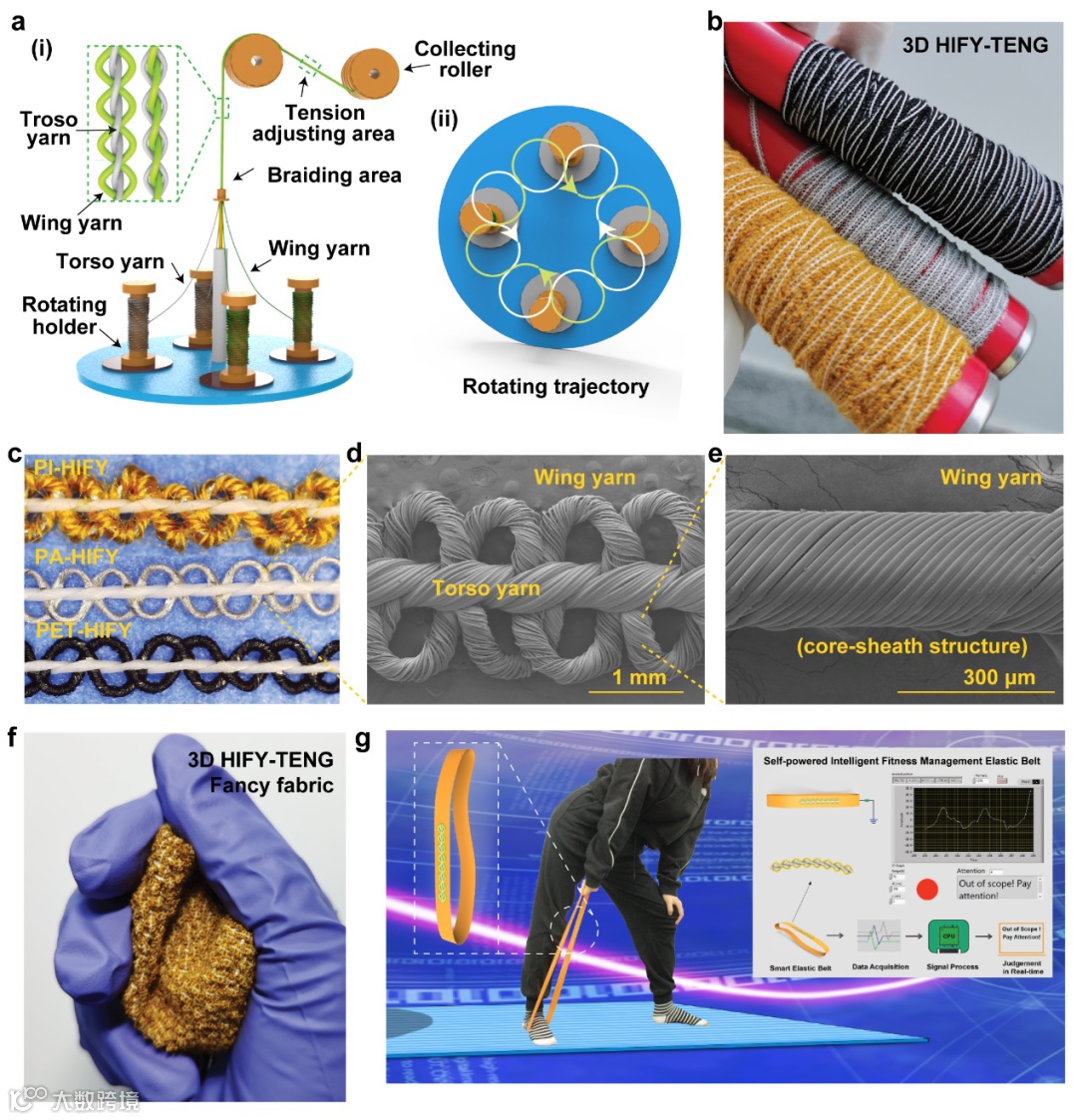 图 1. 用于自供电智能健身系统的 3D 编织分层互锁花式纱线。(a) 3D HIFY-TENG 的制备和编织成形过程运动轨迹(b) 3D HIFY-TENG 花式纱实物图 (c) 三种不同组分翼纱的3D HIFY-TENG 的显微镜图像,分别是聚酰亚胺 (PI)、聚酰胺 (PA) 和聚酯 (PET) (d) 3D HIFY-TENG 的 扫描电子显微镜图像 (e)皮芯结构翼纱的 扫描电子显微镜图像。 (f) 具有平纹结构的 3D HIFY 织物的图像。(g)含自供电瑜伽带和实时监控显示的智能健身系统示意图。