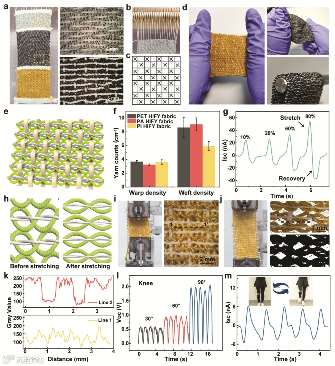 图 4.具有独特的孔隙效果和能量收集效应的3D HIFY-TENG 花式纱织物。(a) 三种3D HIFY-TENG面料的织造工艺及成品 (b) 用于 3D HIFY-TENG 织物的织机 (c) 3D HIFY-TENG 织物的平纹组织图设计 (d) 3D HIFY-TENG 织物的柔韧性、弯曲性和适形性 (e) 3D HIFY-TENG 织物的示意图(f) 3D HIFY-TENG 的经纬密度 (g) 当织物被拉伸成不同的应变时的电输出 (h) 3D HIFY-TENG 织物的孔隙效应示意图 (i)未经拉伸的3D PI HIFY-TENG光学显微镜照片 (j) 3D PI HIFY-TENG拉伸至200%时表现出明显的孔隙效应 (k) 从第 1 行和第 2 行测量的灰度值。3D HIFY-TENG (l) 及其织物 (m) 用于监测膝盖弯曲。