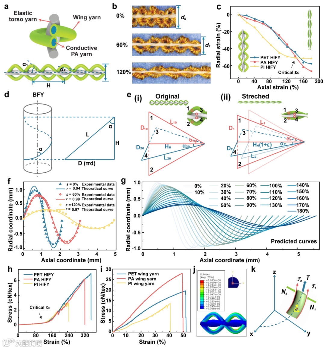 图 2. 3D HIFY-TENG 的几何和机械行为的实验和理论分析。(a) 3D HIFY-TENG 的横截面图和侧视图 (b) 3D HIFY-TENG 被拉伸至 0%、40% 和 120% 伸长率的实物图,在轴向拉伸作用下表现出优异的变形能力 (c)具有不同翼纱的 3D HIFY-TENG 从 0% 拉伸到 180% 时径向应变的变化。(d) 单根螺旋翼纱圆柱展开图 (e) 翼纱和躯干纱线 (i) 拉伸前和 (ii) 拉伸后的几何展开图(f) 3D HIFY-TENG翼纱在0%、60%和120%不同拉伸应变下坐标轨迹的实验数据和理论曲线(g) 翼纱在 0%-180% 不同应变范围内的预测轨迹 (h) 3D HIFY-TENG的典型机械拉伸行为,可分为平缓增加和快速增加两个阶段 (i) 3D HIFY-TENGs 翼纱的典型机械拉伸行为(j)通过 ABAQUS 软件进行有限元分析模拟3D HIFY-TENG 的应力分布 (k) 翼纱的受力分析图