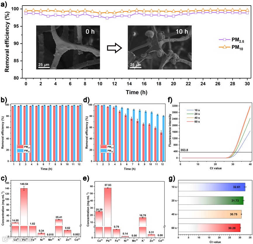 在设计的颗粒物过滤实验中,PCILG@MF过滤器对PM2.5表现出98.83%的去除效率、对PM10表现出99.41%的去除效率。并且在吸附30小时后,去除效率仍然能保持在97%以上,而在相同湿度条件下,商用口罩在12小时的过滤后效率仅为51.94%,表现出严重的下降趋势。通过电感耦合等离子体发射光谱测试显示,PCILG@MF相较于商用过滤器而言,能去除更多包含重金属离子的颗粒污染物。考虑到在施加一定电压后,强极化场可能对病毒的捕获,他们进行了病毒过滤实验。首先将病毒溶液通过雾化器进行雾化以模拟形成病毒气溶胶,然后进行材料捕获,并随后执行病毒核酸聚合酶链反应测定。结果显示,PCILG@MF的靶基因循环阈(Ct)值可以达到30.28,其过滤效率高于商用的无纺布、熔喷布、棉布、碳纤维过滤器(Ct值分别为34.87、34.51、35.32和35.74)。可见PCILG@MF材料在作为空气过滤器方面具有巨大的应用潜力。