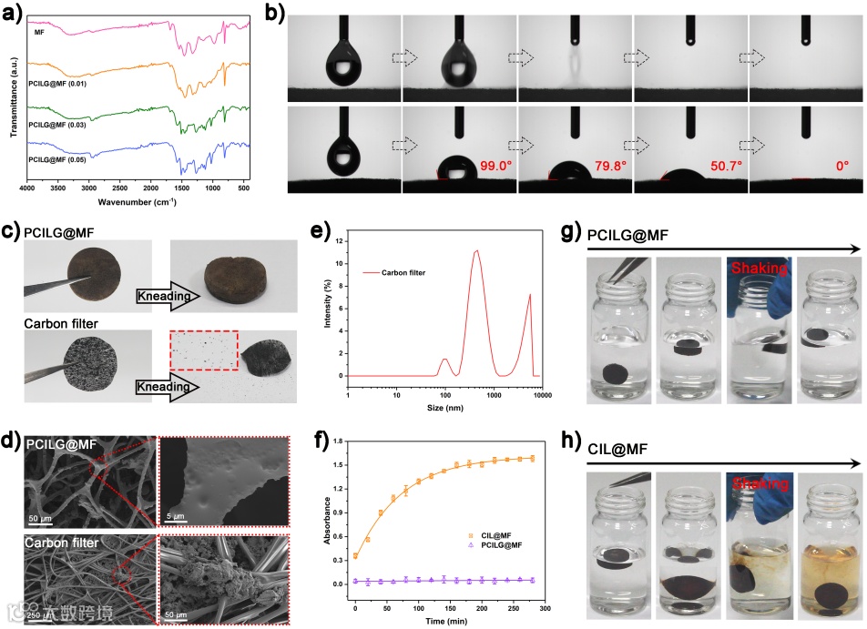 下图1是复合材料(PCILG@MF)的制备示意图,即姜黄素离子液体和乙二醛在水溶剂中发生聚合,并原位包裹到泡沫骨架表面,这里姜黄素离子液体可以作为催化剂自催化该聚合反应。选择姜黄素离子液体作为单体除了因为其良好的生物相容性和抗菌活性之外,还因为它整个分子是π-π共轭的,这使得其分子骨架可以作为电子的传输途径,同时姜黄素还具有很强的金属螯合能力,可以吸附空气中危险的重金属颗粒物。图中得到的PCILG@MF材料微观表面呈现出一定的粗糙特性,这对于提高空气过滤器对颗粒物的接触比表面积和吸附位点十分有利。对水的接触角测试显示该材料具有大于90°的接触角,呈现出良好的抗湿能力,可以避免材料的活性吸附物质因潮解而发生脱落和损失。在模拟人类的使用行为下,与商用的碳基过滤器相比,PCILG@MF具有明显更少的粉体脱落,降低了对肺部潜在伤害的担忧。