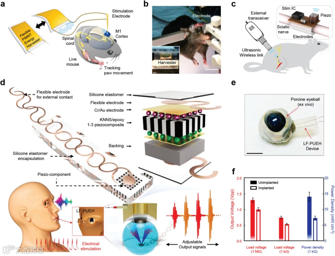 图 19 用于神经刺激的 PENG。 (a) 使用灵活的 PIMNT 收割机对小鼠进行脑刺激的动物实验说明。(b) 连接到双极刺激电极的柔性 PIMNT 刺激器的照片,该电极位于 M1 皮层用于电刺激。比例尺,1 厘米。 (c) 用于刺激大鼠坐骨神经的无电池植入系统示意图。 (d) 用于视网膜电刺激的毫米级柔性超声诱导无线 PENG 的示意图和设计。(e) 植入切除眼球的设备的光学图像,以模拟植入场景。 比例尺,1 厘米。(f) 注入和非注入情况下器件输出电压和功率密度的比较。