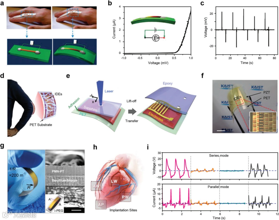 图 4 基于无机压电材料的能量收集。 (a) 基于 ZnO 纳米线的 PENG 连接到人类食指并用手指弯曲的示意图。(b) PENG 的 I-V 特性。插图说明了 PENG 的示意图及其关于测量系统的连接配置。(c) 当手指周期性地来回弯曲时,PENG 产生的开路电压。(d) 使用柔性 PZT 能量收集器的可穿戴应用的示意图。(e) 使用 LLO 方法制备柔性 PZT 薄膜基 PENG 的工艺示意图。(f) 用镊子弯曲的柔性 PZT 能量收集器的照片。比例尺,1 厘米。(g) 用手指弯曲的压电复合材料的照片和弹性骨架上压电复合材料的横截面 SEM 图像。比例尺,50 μm。(h) 不同植入部位的示意图。(i) 来自不同注入位点的串联(上)和并联(下)模式注入的 PENG 的输出性能。