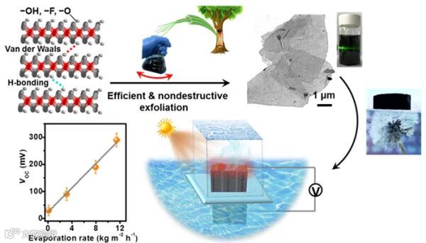 高效且无损的液相剥离一直用于大规模制备具有横向大尺寸的二维(2D)纳米材料(如石墨烯、过渡金属硫化物等),以实现出色的性能和多种应用。由于过渡金属碳(氮)化物(MXene)独特地结合了亲水性、高电导率和光热转换能力,已经在电磁屏蔽、环境修复、光动力诊疗和光热水蒸发等领域得到广泛应用。MXeneTi3C2Tx的液相剥离通常从选择性蚀刻(如HF或电化学蚀刻)开始,然后在水或有机溶剂(如乙醇和二甲亚砜)中进行高功率超声处理以破坏MXene层间范德华力和氢键作用。虽然传统的超声方法能够实现MXene高产率剥离,但这种方式会将其分解至亚微米尺寸甚至量子点,从而牺牲了其大尺寸、化学稳定性和更广泛的应用。