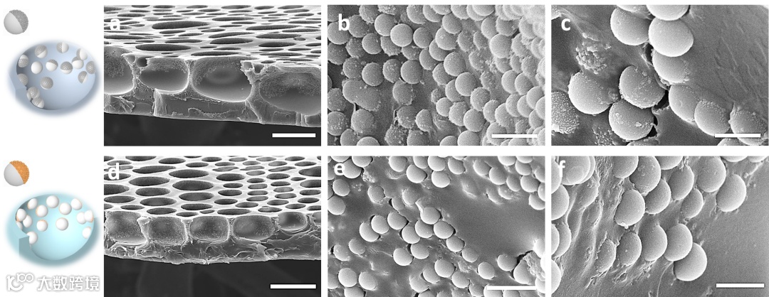 研究团队进一步研究了不同类型的物理/化学异质性粒子在BF过程中的界面组装行为,结果表明,两亲树莓状Janus粒子在孔洞内壁上表现出疏水化修饰面的选择性朝向,而树莓状Janus粒子的纳米银修饰面呈现较为随机的朝向行为(图3)。