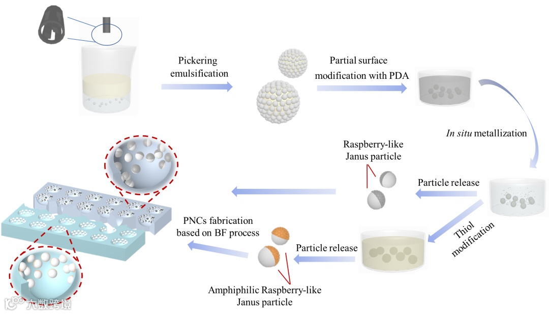 通过将纳米颗粒与聚合物基体相复合,可以获得综合性能优异的聚合物基纳米复合(PNC)材料。在PNC材料的制备过程中,如何实现纳米颗粒在聚合物基体中的高效均一分散,并通过功能性粒子的有效复合实现特定的PNC应用,成为了一项重要的挑战。共混法、原位聚合法和溶胶-凝胶法等已被用于实现纳米颗粒在聚合物基体中的分散,然而这些方法均存在化学过程复杂、原料不易获得等限制,且很难同时实现纳米颗粒在聚合物基体中的均一分散和选择性表面分布。