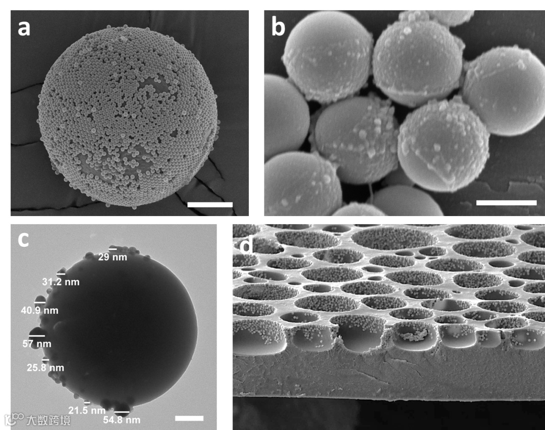 研究团队通过胶质体法制备得到了具有树莓状结构的Janus粒子,并利用两亲化表面改性,获得物理与化学双异质性的Janus粒子(图2)。进一步通过将Janus粒子加入聚合物溶液中并实施BF成膜过程成功制备了多孔型PNC薄膜。在BF过程中,所浇筑液膜的表面层与底面层之间的温差会直接影响溶剂挥发及所造成Marangoni对流过程,而这也会进一步影响液膜内Janus粒子受Pickering乳化效应所实现的界面组装行为,以及模板水滴阵列的排列规整性和尺寸均一性。基于以上认识,研究团队通过实验调控,在低温条件下实现了Janus粒子在聚合物基体内的均一分散以及在孔洞内壁处的局部选择性分布(图2)。
