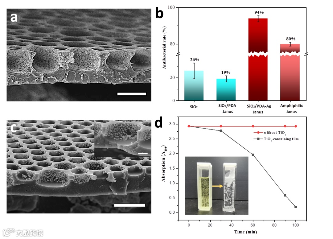 图4. 不同类型粒子修饰多孔膜的抗菌性能及TiO2纳米颗粒修饰多孔膜的光催化性能