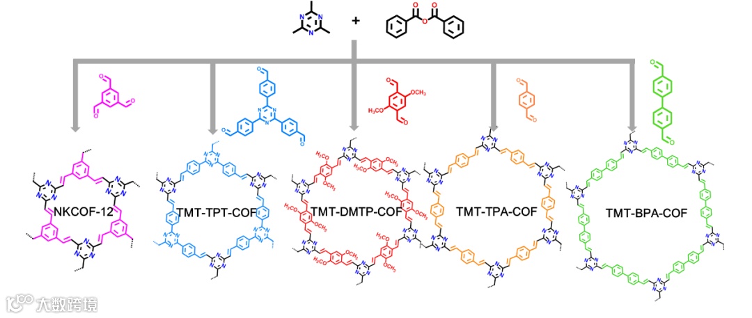 如图2所示,作者选取三甲基三嗪、两头或三头醛作为反应单体,并加入苯甲酸酐为助熔剂。红外光谱、固体核磁等测试验证了聚合反应的成功进行。粉末X射线衍射证实了材料的高结晶性;氮气吸附测试研究了材料的多孔性。通过与文献报道对比发现,熔融聚合生成的COF材料都具有更高结晶性和更高的比表面积(图3)。