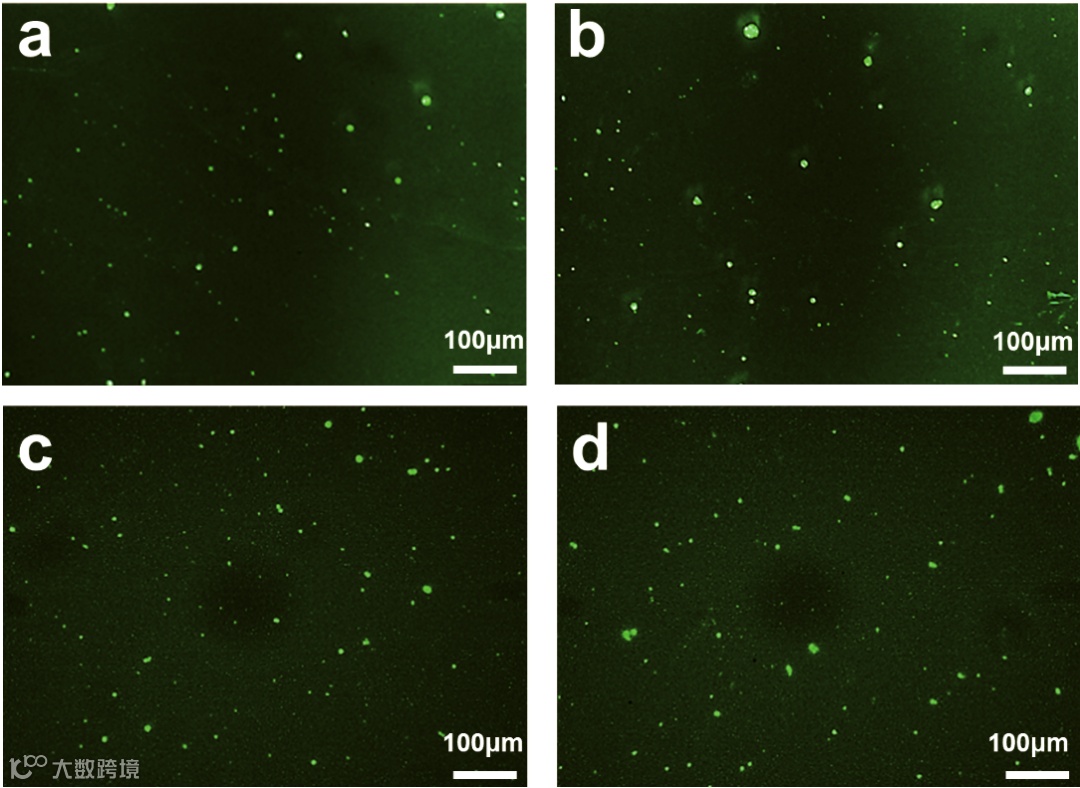 图2. 3wt% EPE(a,顶部;b,底部),5wt% EPE(c,顶部;d,底部)改性沥青荧光显微照片