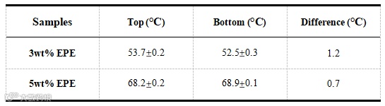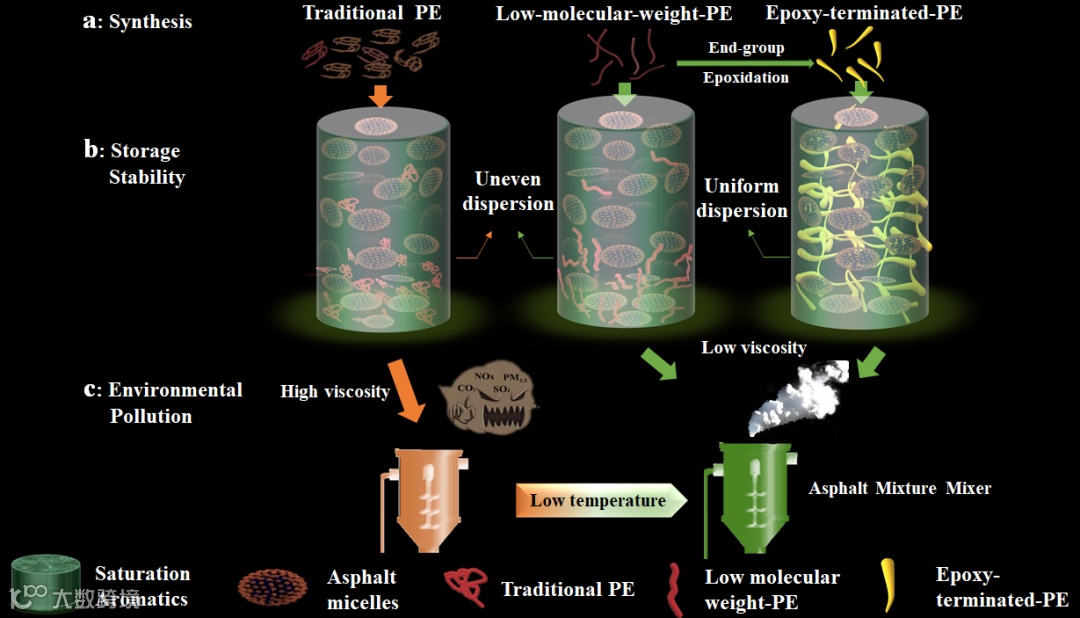 长安大学颜录科教授和中科院化学所李化毅副研究员合作,降低PE分子量同时在其链末端引入官能团,有效解决聚乙烯改性沥青拌合摊铺温度高、储存稳定性差的问题。本文合成了一种低分子量端环氧基聚乙烯(EPE)(图1a),EPE的极性基团可与沥青中的酸性物质反应,在沥青中形成网络结构(图1b)。EPE添加量为5wt%时改性沥青的顶部与底部软化点之差为0.7℃,显著提高了沥青的储存稳定性(表1)。荧光显微图像也侧面证实了EPE在沥青中的均匀分散和良好的储存稳定性(图2)。此外,EPE由于分子量低,降低了沥青的高温粘度,实现了较低的混合和摊铺温度(图3),从而达到了良好的节能减排效果(图1c)。该工作将为PE在沥青中的应用提供进一步的指导。