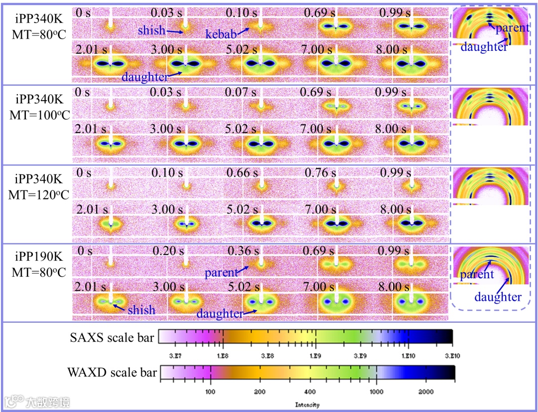 实验结果表明样品结构的形成依赖于模具温度和分子量大小,如图1所示。低分子量的等规聚丙烯(iPP190K)样品只有少量的分子链高于临界取向分子量(M*),因此iPP190K样品中只能形成少量的shish结构。相比之下,高分子量的等规聚丙烯(iPP340K)样品表现出明显的shish-kebab结构,并伴随着子母片晶(parent-daughter lamellae)结构。随着模具温度的升高和分子量的减小,分子链的活动能力增强,因此各结构开始形成的时间也逐渐延长。