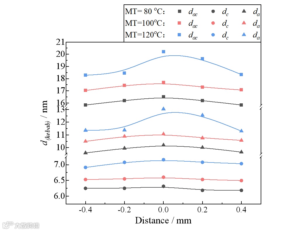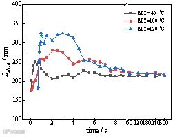 此外,模具温度只影响子母片晶结构,模具温度越高,dac的值越大。然而,shish结构的最终长度(Lshish)不受模温的影响,如图5所示。这是因为shish结构主要是由较长的分子链组成,而同一种材料中长链分子的含量是一定的。