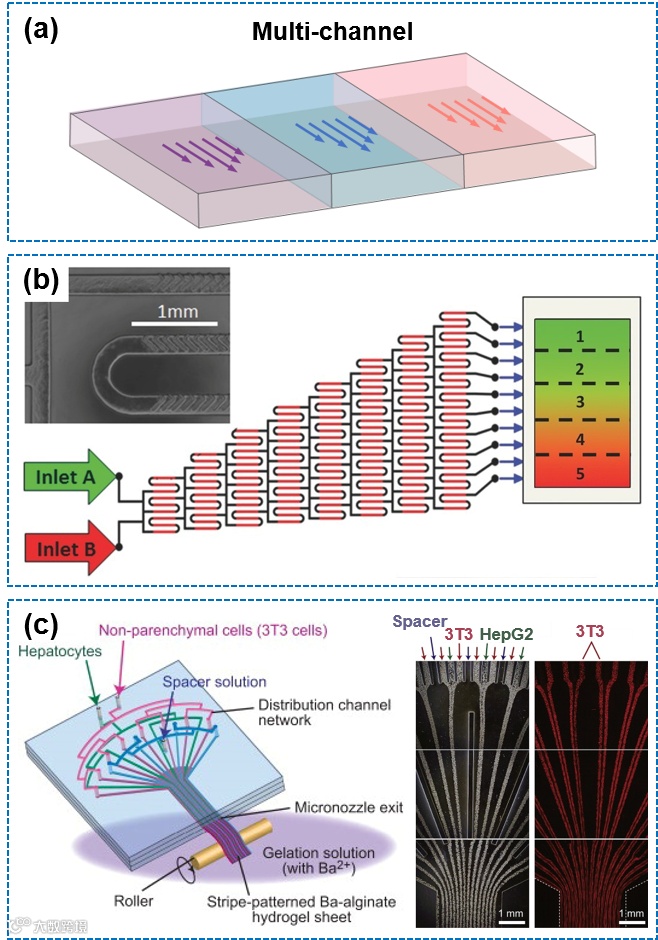两个或多个单通道微流控层流平行堆积可以形成双通道或多通道微流控层流。双通道微流控层流可以形成稳定的液/液界面。因此,可以通过界面聚合制备聚合物薄膜。利用多通道微流控层流,流体在微通道内不断地分流—混合,可以形成连续的且互不干扰的浓度或组分梯度,通过固化层流可以制备异质聚合物薄膜(图3)。