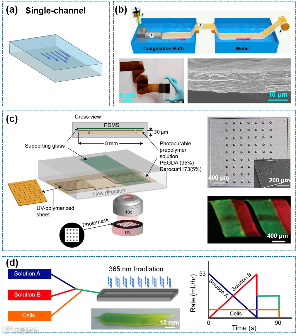 如图1所示,将单个微通道内的层流定义为单通道微流控层流。单通道微流控层流可以通过适当的成膜方法(如离子交联、光聚合等)制备单层均质或异质聚合物薄膜(图2)。重要的是,利用光聚合和合适的掩膜版,可以获得图案化聚合物薄膜。此外,通过调节微流控通道的厚度和宽度,可以很容易地调控聚合物薄膜的厚度和宽度。