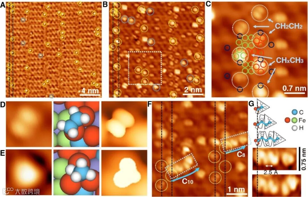 为了清楚识别表面物种和反应位点,研究团队又系统进行了低温STM表征。室温下在表面吸附的少量乙烯,绝大部分吸附在畴界位置(~ 90 %,图3A),乙烯的两个甲基均清晰可见。提升乙烯的吸附量,畴界出现了一类三角形的物种,即为室温下观察到的链引发物种(~75 %吸附在畴界,图3B)。结合碳化铁表面结构分析可知,乙烯和链引发物种均优先出现在畴界三个铁原子构成的特殊位点(图1C箭头所示,以及图3C)。链引发物种具有三角形形貌特征,端部为CH3基团;DFT计算证实该物种为乙烯异构化所形成的亚乙基(CHCH3)物种(图3E)。进一步提高乙烯吸附量,在表面可以观察到聚乙烯短链(图3F),远离畴界的终端形貌保持为三角形,对应预CH3基团;而另一端仍锚定在畴界特殊位点,因此反应只能在畴界位点发生、且以乙烯插入的方式完成链增长(图3G)。