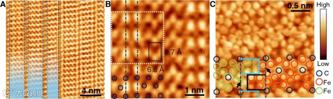 图1. 由Fe(110)单晶制备的θ-Fe3C(102)表面。(A) 由畴界分隔开的不同宽度畴区条带;(B) 畴区条带内部单胞结构;(C) 表面高分辨原子像及其结构模型。
