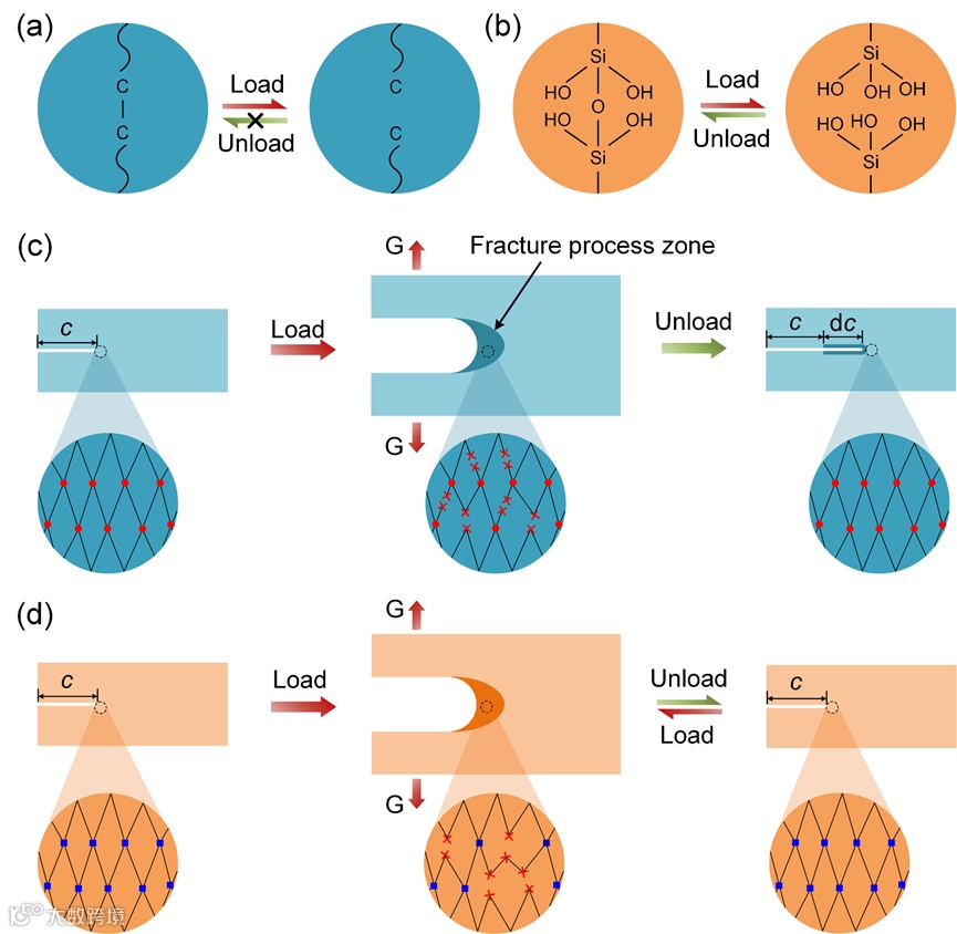研究人员根据提出的抗疲劳机制对该实验结果进行了分析(图4)。在MBAA交联的PAAm网络中,因加载过程中断裂的交联点为不可逆的C-C键,在卸载过程中断裂的网络不可修复,从而导致了裂纹扩展;而在silane交联的PAAm网络中,因加载过程中断裂的交联点为可逆的Si-O-Si键,在卸载的过程中网络能进行修复,使得裂纹不产生扩展,从而提高了水凝胶的疲劳阈值。