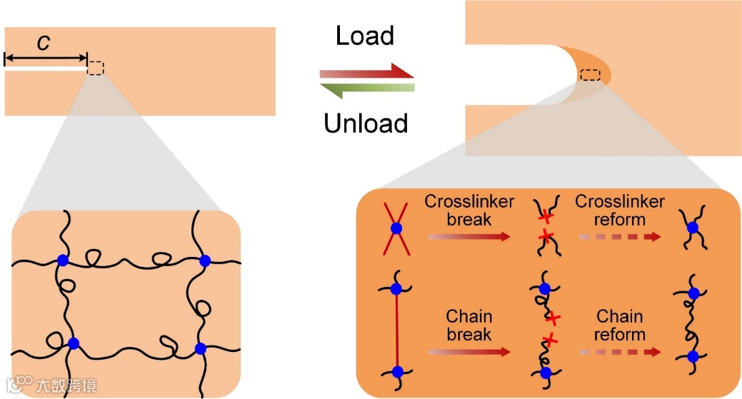 在这样的背景下,南方科技大学杨灿辉课题组提出了一种新的基于无定形聚合物网络的抗疲劳机制:在合适的加卸载速率下,裂纹尖端附近的可逆共价键因加载而发生断裂,从而耗散能量;在卸载过程中,断裂的可逆共价键会发生重组,使得聚合物网络和加载前一致,水凝胶因此获得了一定的抗疲劳特性(图1)。