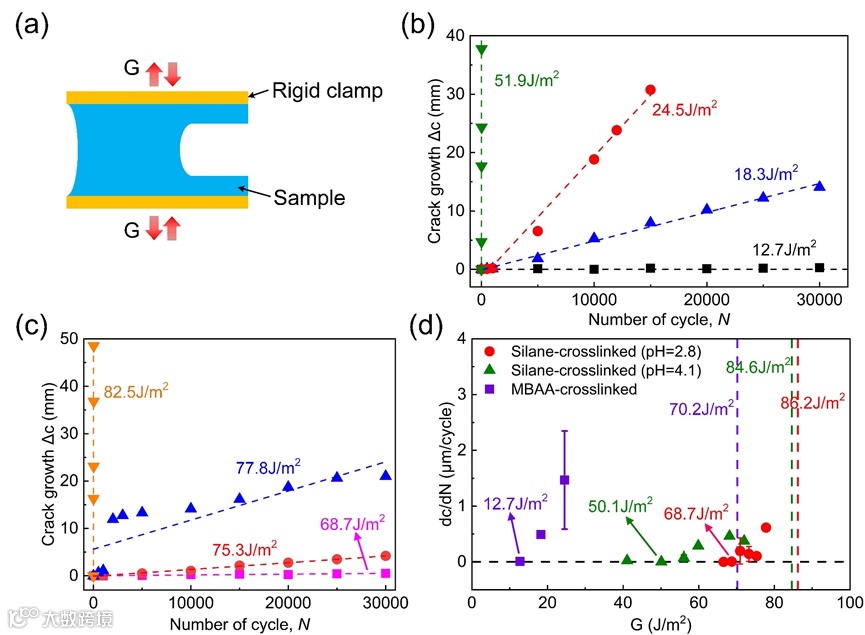 接着,研究人员对两种水凝胶进行了疲劳断裂实验(图3),分别测得了MBAA交联的PAAm水凝胶以及两种silane交联的PAAm水凝胶 (前驱液的pH值分别为2.8和4.1)的断裂韧性以及疲劳阈值。结果表明,MBAA交联的PAAm水凝胶和silane交联的PAAm水凝胶(pH=2.8)的断裂韧性接近,分别为70.2J/m2和86.2 J/m2。但二者的疲劳阈值相差很大:MBAA交联的PAAm水凝胶疲劳阈值约为12.7 J/m2,比较符合Lake-Thomas模型的预测;silane交联的PAAm水凝胶疲劳阈值约为68.7 J/m2,并不符合Lake-Thomas模型的预测。