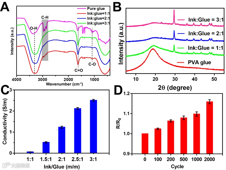 图2. 墨水/胶水复合材料的结构表征和导电性。