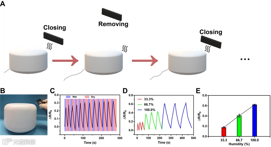 传感器能够保持应变下信号响应的稳定性。在25%到150%的应变下传感器均能保证良好的信号输出。在500次动态拉伸-收缩循环后,传感器仍能够稳定地输出电信号响应。传感器的电阻变化与应变近似呈现出二次函数的关系(图3D),GF(gauge factor)与应变成正比,与GF的计算公式(GF=(∆R/R0)/ε)保持一致。同时在轻压传感器时,传感器依然能够捕捉这种由按压导致的微小形变。柔性传感器表现出响应时间和回复时间相同的特点,这表明该传感器具有快速响应能力,可应用于实际应变检测。