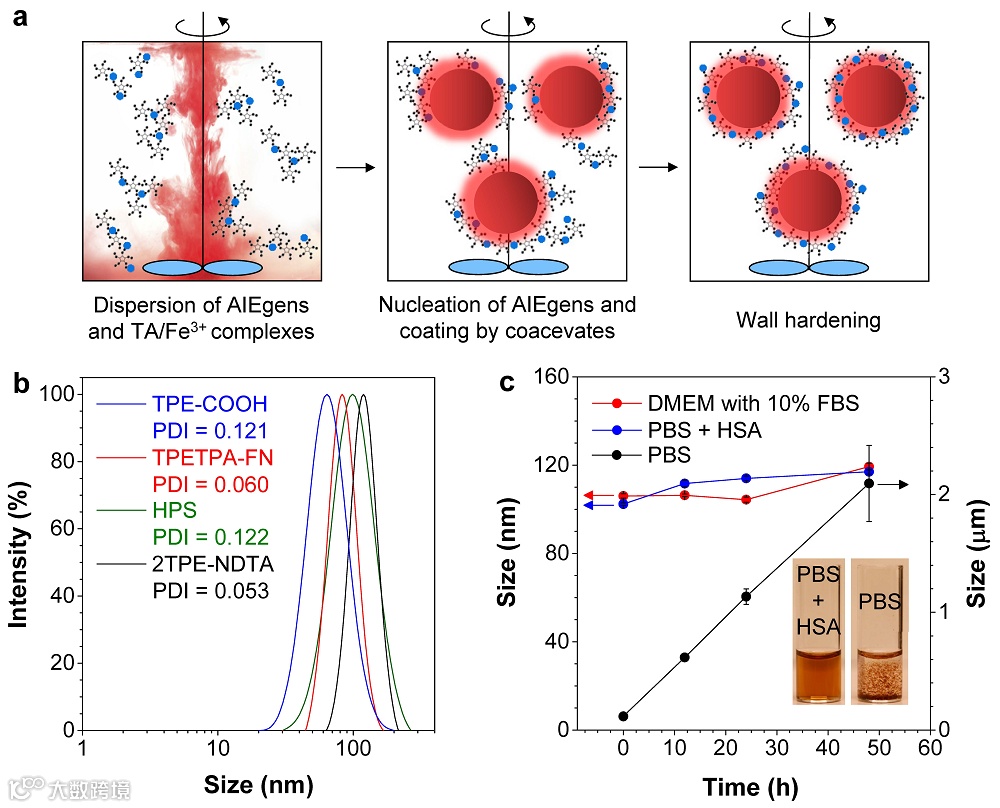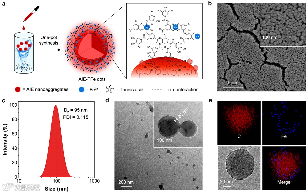 近日,香港中文大学(深圳)理工学院唐本忠院士团队联合复旦大学附属上海市公共卫生临床中心彭琛副研究员报道了一种普适性的策略用于制备有机-无机杂化的AIE核壳纳米颗粒。该研究借鉴了单宁酸(TA)与金属离子(Mn+)通过配位作用形成的多功能金属多酚网络(MPN)及其可附着在多种纳米材料表面的特性。考虑到AIE纳米聚集体的多芳香环表面和TA分子中苯环基元之间的疏水相互作用,MPN材料理论上亦可以沉积在AIE纳米聚集体表面从而制备有机-无机复合的核壳纳米颗粒,同时表面的亲水多酚亦有助于提高所得纳米颗粒的胶体稳定性。基于这样一个想法,作者合成了一个红色荧光的AIE分子2TPEA-AQ,用于研究其与MPN在水中的自组装过程。通过将含有AIE分子的四氢呋喃(THF)溶液滴入含有TA和Fe3+的MPN水溶液,作者成功地以一锅法制备了以AIE纳米聚集体为核和以MPN为壳的纳米颗粒,核壳的构造进一步通过能量色散X射线谱(EDX)和X射线光电子能谱分析(XPS)等实验证实。与已报道文献不同的是,传统的MPN沉积方法都是基于先形成模板再沉积的实验思路,本文采用了聚集和沉积协同进行的方法,为大规模连续制备MPN附着的纳米材料提供了新的合成策略。