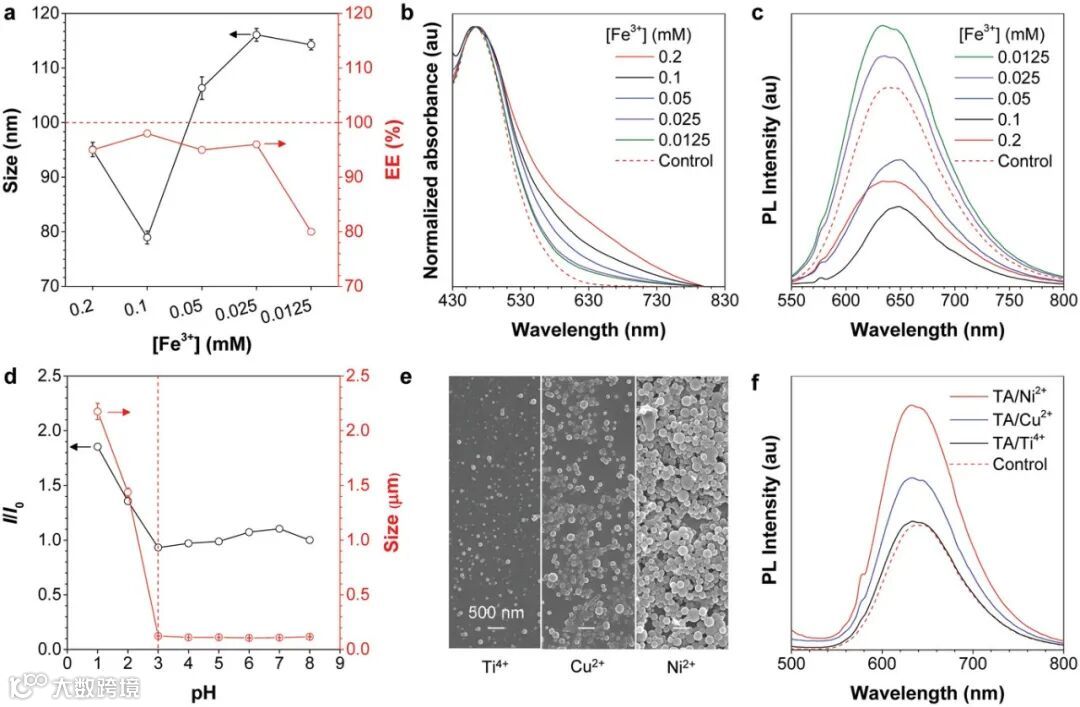 在文章中,作者用凝聚作用(Coacervation)或者叫相分离(Phase separation)解释了自组装过程的机制。研究表明,很多生物大分子,例如蛋白质,在外界理化条件的刺激下,会自发通过凝聚作用形成聚集体。类似地,当含有疏水AIE分子的THF溶液与含有MPN的水溶液混合时,水与THF的交换过程使得含有AIE分子的THF溶液过饱和,AIE分子析出形成纳米聚集体。另一方面,对于含有MPN的水溶液而言,THF的滴入使得亲水的MPN发生凝聚作用,并且在AIE纳米聚集体的疏水表面沉积进而相互交联形成3D复合物网络。随着pH的调整,最终形成稳定的核壳纳米结构。从这个实验现象可以得出,在自组装过程中,AIE分子的成核速度与MPN的沉积速度应该处于同一个量级,因此,维持聚集和沉积过程的平衡对于制备这种类型的纳米颗粒至关重要。作者进一步探究了纳米颗粒的稳定性,实验结果表明,以MPN为表面的AIE纳米颗粒在PBS中会因为盐离子的屏蔽效应发生聚集而形成微米级颗粒,但是蛋白质的加入可以提高其稳定性,因此这种AIE纳米颗粒在富蛋白质分子的生物基质中也具有很好的胶体稳定性。另外,其他AIE分子,包括TPE-COOH ,TPETPA-FN,HPS和2TPE-NDTA,都可以通过这种自组装的方法得到稳定的纳米颗粒,这体现了一锅法制备策略的普通适用性。在后续的研究中,作者还探索了铁离子加入量以及使用其它金属离子(Ti4+, Cu2+, Ni2+)对于所形成纳米颗粒形貌和光物理性质的影响,结果表明这些变量都会对最终形成的纳米核壳结构的理化性质产生影响。总体来说,本文展示的纳米组装方法可以实现对核壳两个组分的灵活调整,在实际应用中可以根据所需目标定制化制备纳米颗粒。