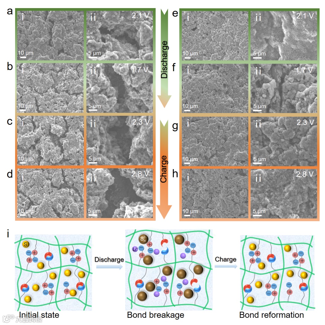 图5. (a-d)PVDF粘结剂的硫阴极的SEM图像。(e-h)ZIP粘结剂的硫阴极的SEM图像。(i)氢键交联的动态网络和静电相互作用在放电/充电过程中的作用示意图。