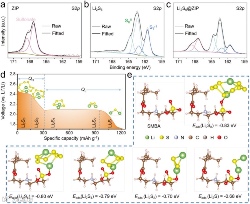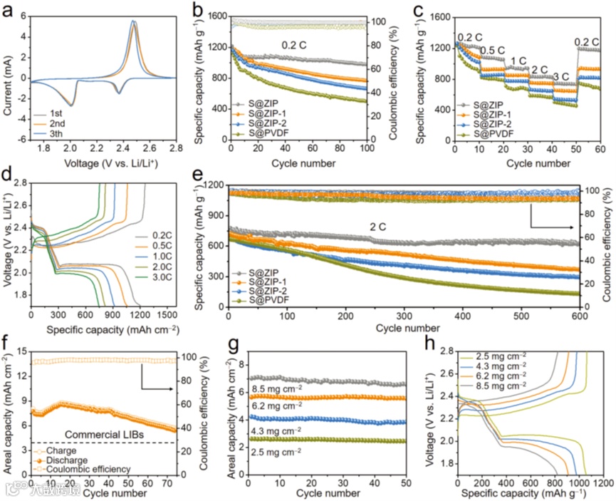 在分子水平上,ZIP基质中丰富的聚合两性离子同时具有亲硫和亲锂部分,能够通过协同阳离子-阴离子调节同时限制多硫化物扩散并加速硫氧化还原动力学。通过DFT对结合能进行计算发现ZIP粘结剂对LiPSs的吸附性能明显高于PVDF。紫外光谱和X射线光电子能谱测试也证实了ZIP粘结剂和LiPSs之间的相互作用。通过原位拉曼光谱对锂硫电池的循环过程进行了表征。ZIP粘结剂电池在放电初期表现出明显的S8特征峰。随着循环的进行,几乎没有观察到多硫化锂相关峰。充电过程中上述过程发生逆转,最终S8特征峰均重新出现,表明LiPSs的氧化还原反应完全可逆。同时在初始和最后阶段均只能观察到典型的S8峰,而LiPSs峰不明显,证实了ZIP粘结剂具有出色的LiPSs吸附效果并可促进LiPSs的氧化还原动力学。原位拉曼光谱表征结果为评估粘结剂抑制穿梭效应的能力提供了重要依据。