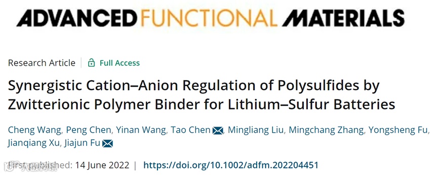 近日,南京理工大学傅佳骏教授、陈涛教授在国际知名期刊Advanced Functional Materials上发表题为“Synergistic Cation–Anion Regulation of Polysulfides by Zwitterionic Polymer Binder for Lithium–Sulfur Batteries”的观点文章。该文章巧妙地设计了一种同时具有亲锂性和亲硫性的两性离子聚合物粘结剂,它可通过与多硫化锂的强相互作用,实现对阳离子和阴离子的协同调节。具体而言,这项工作通过合理设计自由基共聚,将聚合物两性离子、聚(乙二醇)甲基醚丙烯酸酯(PEGA)和丙烯酸2-羟乙酯(HEA)单体共价连接在烷基和烷氧基基体中,开发了一种高度支化的两性离子聚合物粘合剂(ZIP),以用于在Li-S电池中进行有效的多硫化物调控。变温红外光谱结合二维相关光谱分析表明ZIP中存在氢键以及季铵盐阳离子和磺酸盐阴离子之间的离子相互作用。