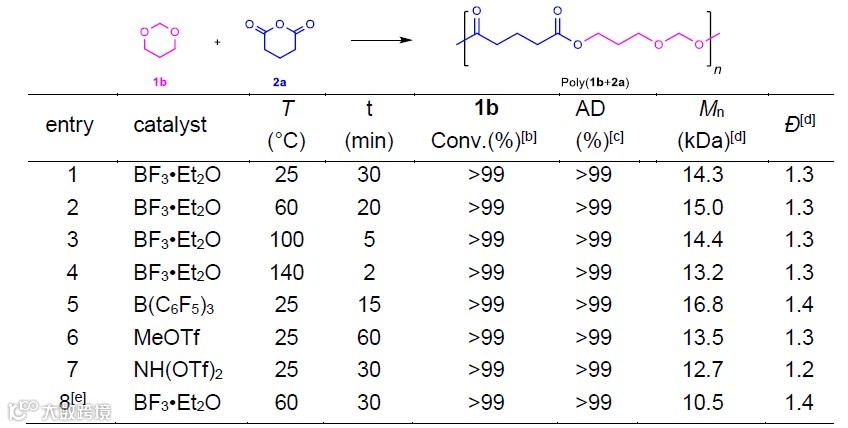 在共聚酯合成的方向,张兴宏团队近日从碳一单体甲醛出发,选择了甲醛与二醇的缩合产物环缩醛与廉价的酸酐为单体,报道了无金属阳离子共聚的途径,高效、快速的得到了产物结构明确、两端为羧基的全交替聚酯(图1)。如选用戊二酸酐与1,3-二氧六环在三氟化硼乙醚络合物催化下室温共聚1小时,1,3-二氧六环的转化率>99%,所得产物交替度>99%。如将反应温度提高至140℃,该共聚反应可在2min内完成,且分子量、交替度和端基结构均保持不变。该方法对大多数阳离子催化剂具有较好的普适性。