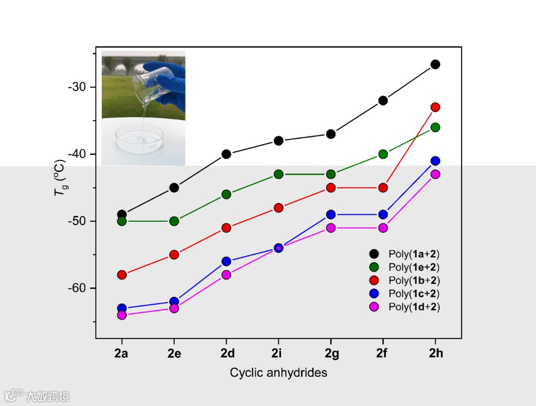 该方法可以扩展至其他常见的的4种环缩醛和8种环酸酐,共得到了45种主链含缩醛结构的新型聚酯,产物分子量在2.0-33.3k之间。通过加入不同量的水作为链转移剂,可以在一定范围内调节聚酯的分子量。这一类含缩聚结构的聚酯具有高的热分解温度(275℃-324℃)、较低的玻璃化温度(-64℃—-27℃)和双端羧基结构(如图2),同时在室温下表现出类似甘油的流动性。这些物化性质使其在弹性体方面有潜在应用价值。