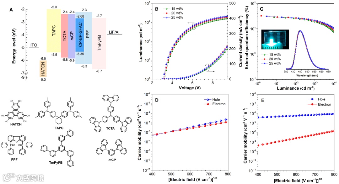 图3. (A)单色光器件结构及所用功能层分子结构;掺杂器件(B)亮度-电压-电流密度曲线和(C)外量子效率-亮度曲线,图C内为4V电压下的EL曲线;(D)非掺薄膜和(E)掺杂薄膜的不同电场下的载流子迁移率曲线。