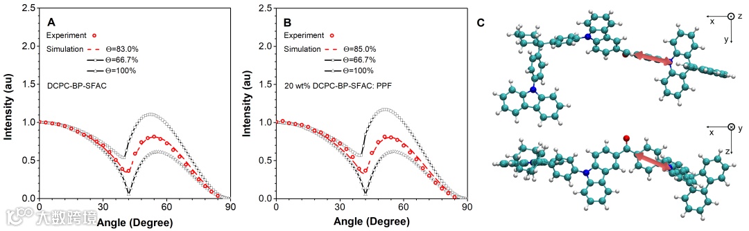 图1. DCPC-BP-SFAC的非掺薄膜(A)和掺杂薄膜(B)的水平偶极取向比例;(C)跃迁偶极距取向的方向示意图。