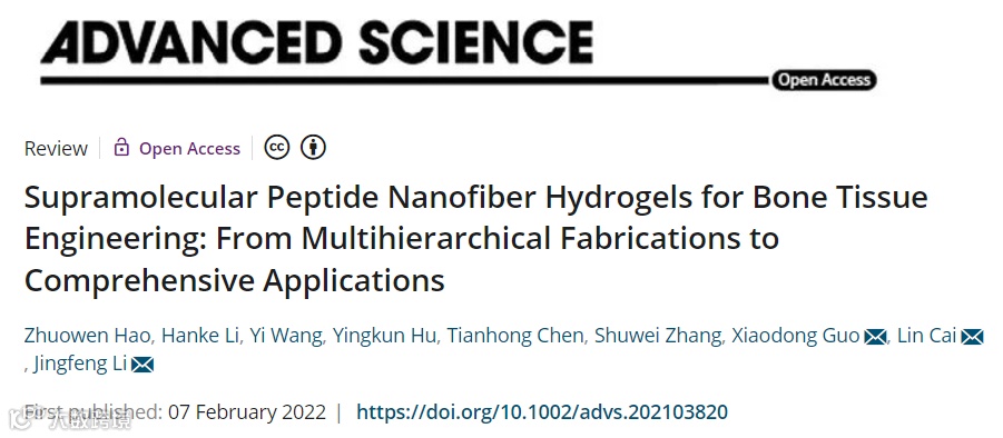 近年来,骨组织工程正逐渐成为一种替代自体骨移植用于修复临界大小骨缺损的理想策略,主要由生物材料、种子细胞、活性因子及生物物理刺激等四大基本要素构成(DOI: 10.3389/fcell.2021.790050)。但由于缺乏理想的生物材料,天然骨组织的多维复杂性仍难以模拟。超分子肽纳米纤维水凝胶是一种可用于骨组织工程的新兴材料,通过非共价相互作用发生自组装,形成类似于天然细胞外基质的纳米微环境,同时易于功能化,具有天然可降解性、低免疫原性、机械可调性等优势,用于骨组织工程具有巨大应用前景。