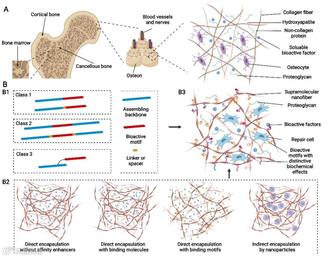 图3:天然骨细胞外基质结构及超分子肽纳米纤维水凝胶功能模拟策略