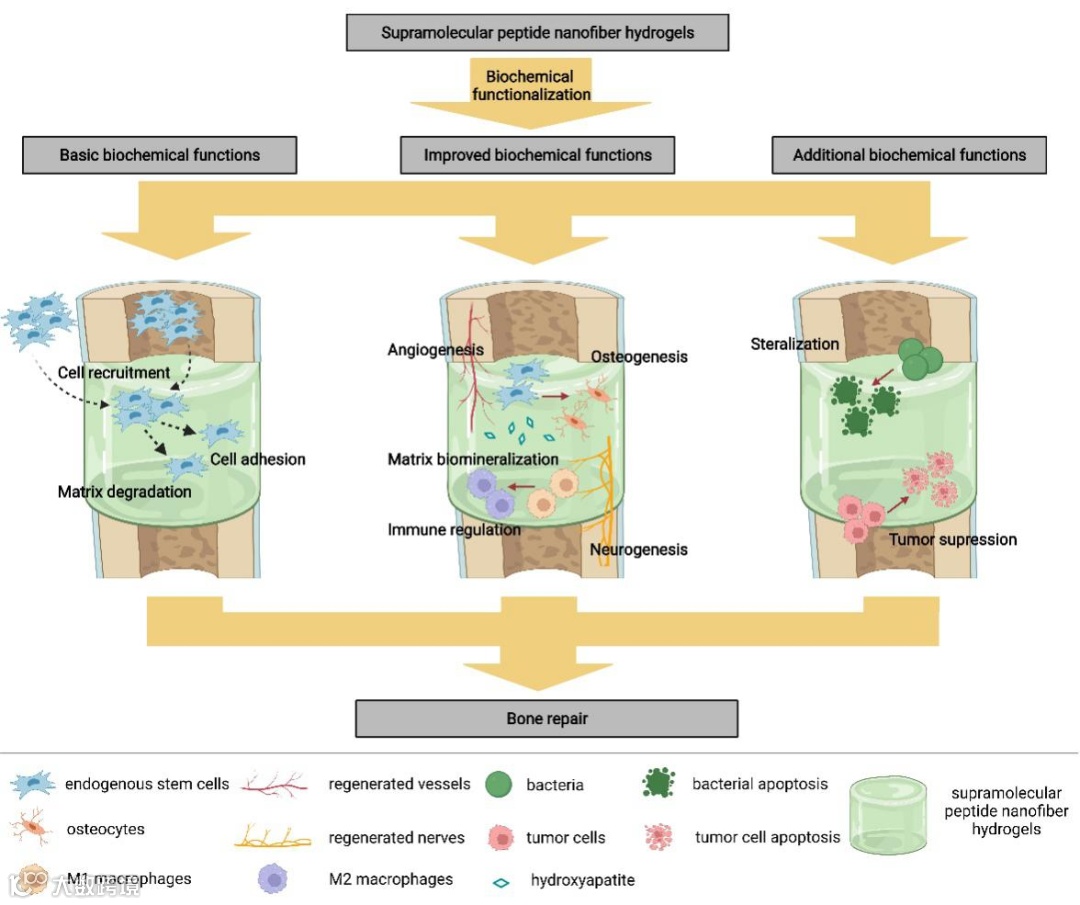 图4:基于超分子肽纳米纤维水凝胶提供骨组织再生所需的多种的生物化学功能