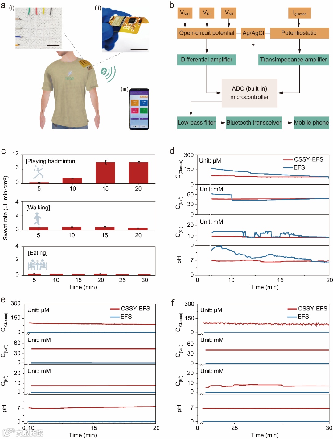 近日,南京大学张晔课题组将多股亲水棉纤维和基于碳纳米管的传感纤维共加捻制备得到芯鞘传感纱线,并将之刺绣到超疏水织物基底上,开发了一种新型织物电化学汗液传感器。由于芯鞘传感纱线与超疏水织物基底之间存在较大的亲疏水差异,汗液只能被芯鞘传感纱线捕获,并传输至传感区域,因此展现出了较高的汗液捕获效率。得益于此设计,仅需0.5 μL的汗液就可以实现稳定的电路连接,是迄今为止报道的织物电化学传感器最低汗液检测量的1/20。与此同时,芯鞘传感纱线在弯曲、扭转和抖动等动态变形过程中也保持了稳定的性能。其可进一步与外置芯片等集成制作成智能运动衬衫,用于实时监测用户在剧烈运动状态(如打羽毛球)和温和出汗状态(如走路、吃饭)下汗液的多种化学信息(如葡萄糖、Na+、K+、pH值)。